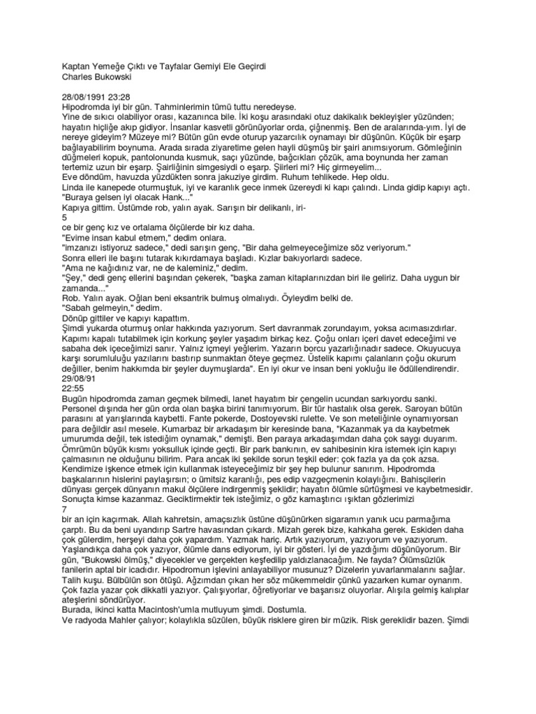 Tümü bugün charles bukowski öldükten sonra yayınlanmış bi kitaptır ve benim gözümde pulp la aynı değerdedir. Anosmi 2 sene önce 0 24 dakika okuma 351. Kaptan yemeğe çıktı ve tayfalar gemiyi ele geçirdi charles bukowski. Kaptan yemeğe çıktı ve tayfalar gemiyi ele geçirdi by yeşim özbirinci 6 ocak 2013 22 mart 2020 12 ismi ile gönlümü ayrı fetheden charles bukowski nin kaptan yemeğe çıktı ve tayfalar gemiyi ele geçirdi kitabından altı çizikler bizleri yine hüzünlendiriyor.